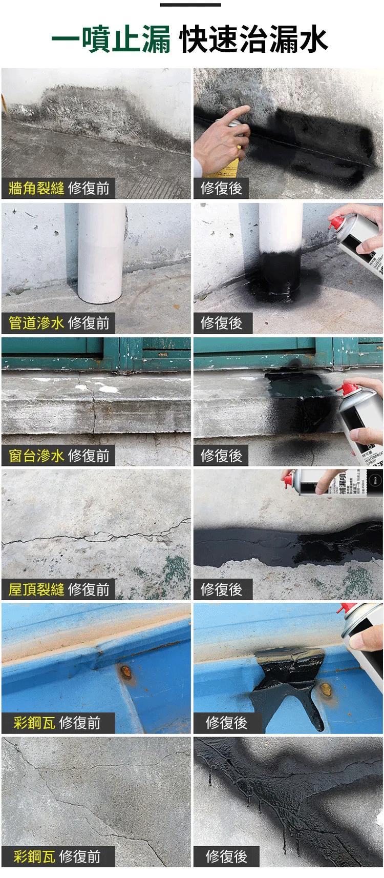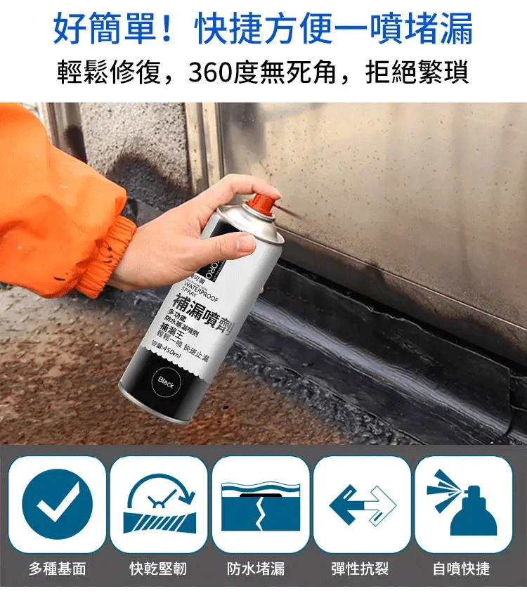 大容量,360°無死角,不敲不砸,四色可選, 哪裏漏水噴哪裏,高溫不化,低溫不裂!開蓋即噴,耐高低溫,多基面適用,防水好用耐磨。高彈柔韌不怕開裂,結實牢固不脫落 墻面、地面、裂縫、屋頂、瓷磚、鐵皮、衛生間補漏,用途廣泛,一噴即可,方便好用!
